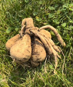 After cutting back, leave the tubers in the soil for three to seven days. This gives them time to toughen their outer skin which is a natural protection against rot and dehydration in storage.